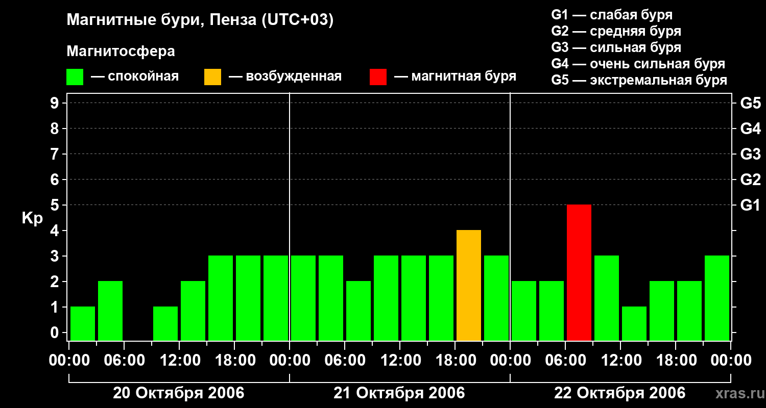 Изменения геомагнитного индекса Kp с 20 по 22 октября 2006 года для средних широт