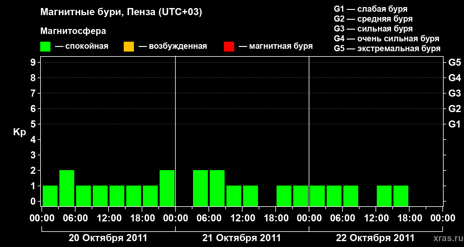 Изменения геомагнитного индекса Kp с 20 по 22 октября 2011 года для средних широт