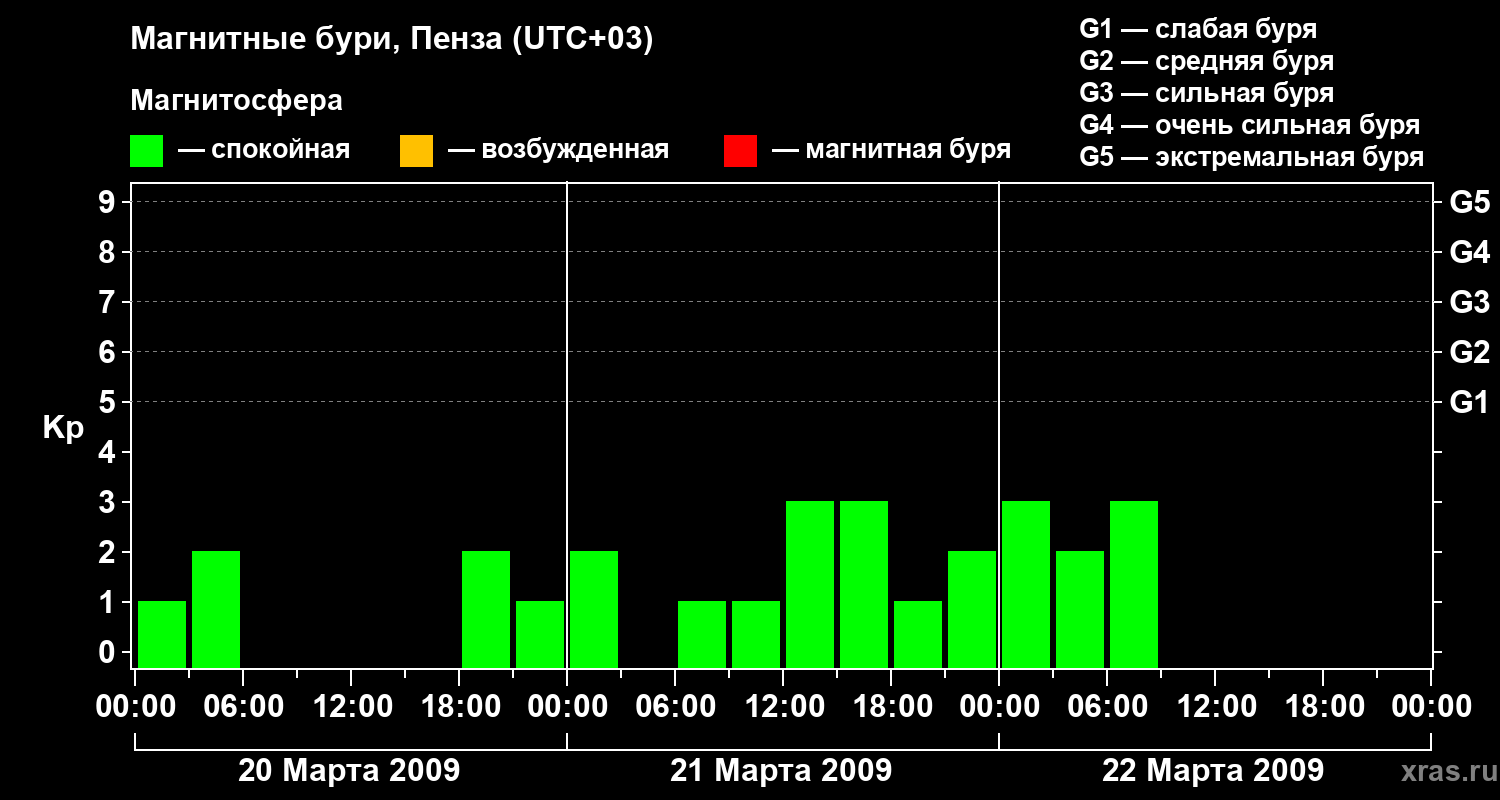 Изменения геомагнитного индекса Kp с 20 по 22 марта 2009 года для средних широт