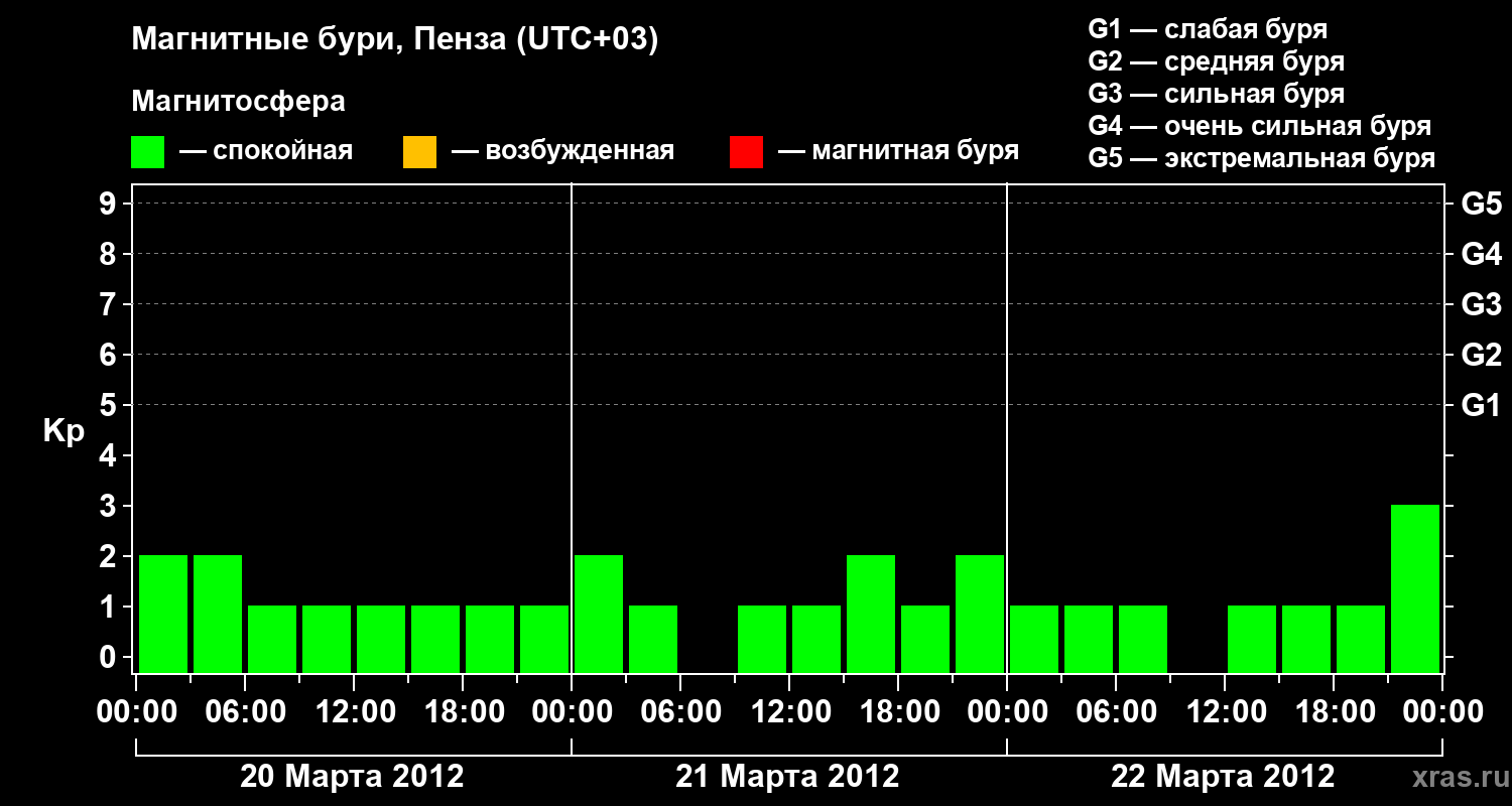 Изменения геомагнитного индекса Kp с 20 по 22 марта 2012 года для средних широт