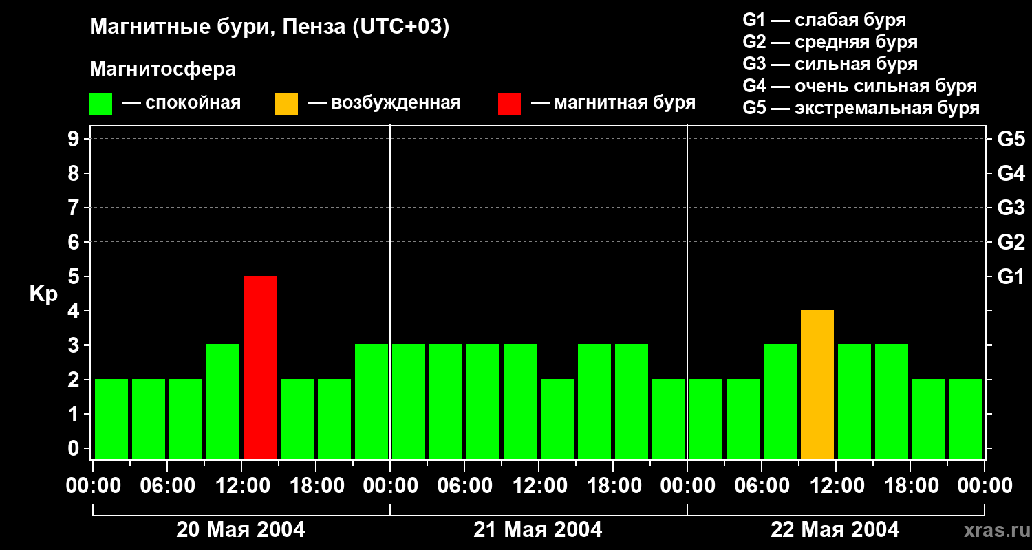 Изменения геомагнитного индекса Kp с 20 по 22 мая 2004 года для средних широт