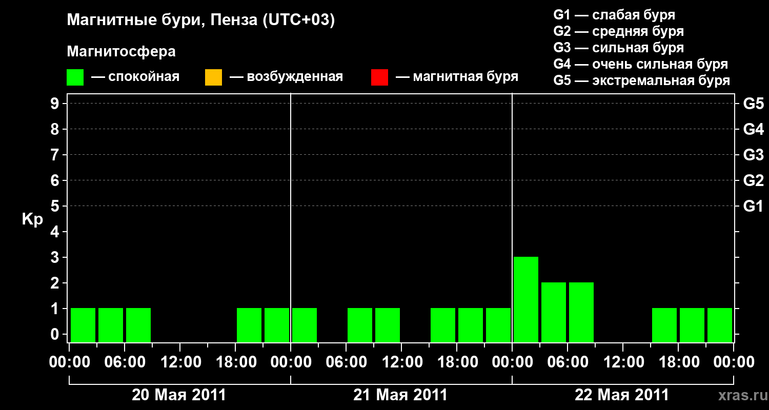 Изменения геомагнитного индекса Kp с 20 по 22 мая 2011 года для средних широт