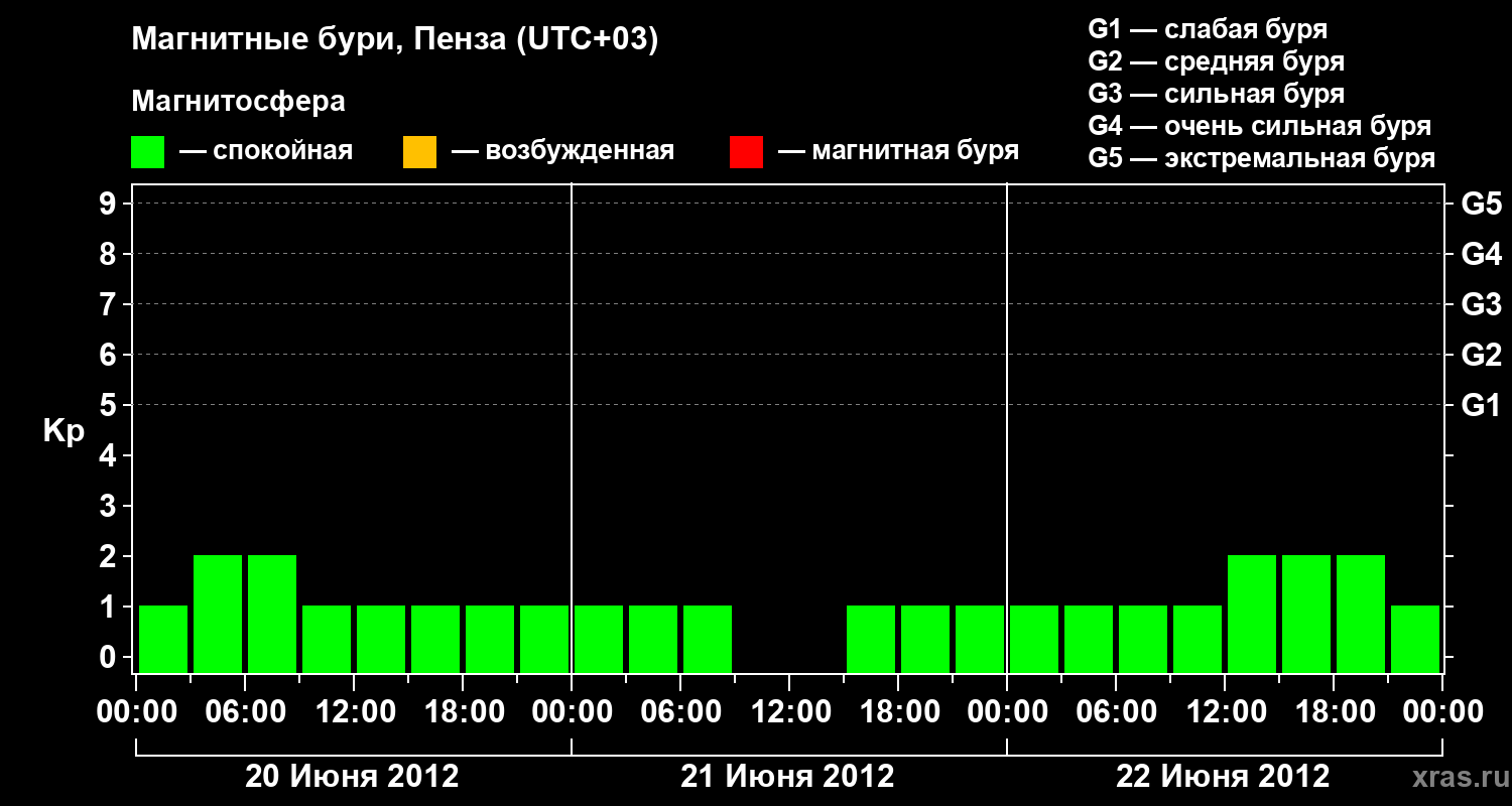 Изменения геомагнитного индекса Kp с 20 по 22 июня 2012 года для средних широт
