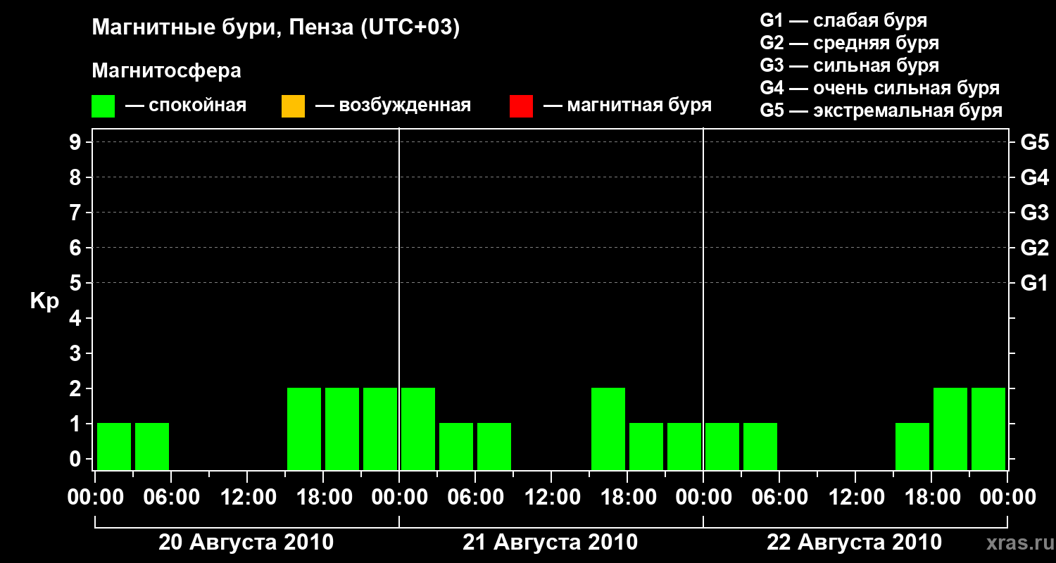 Изменения геомагнитного индекса Kp с 20 по 22 августа 2010 года для средних широт