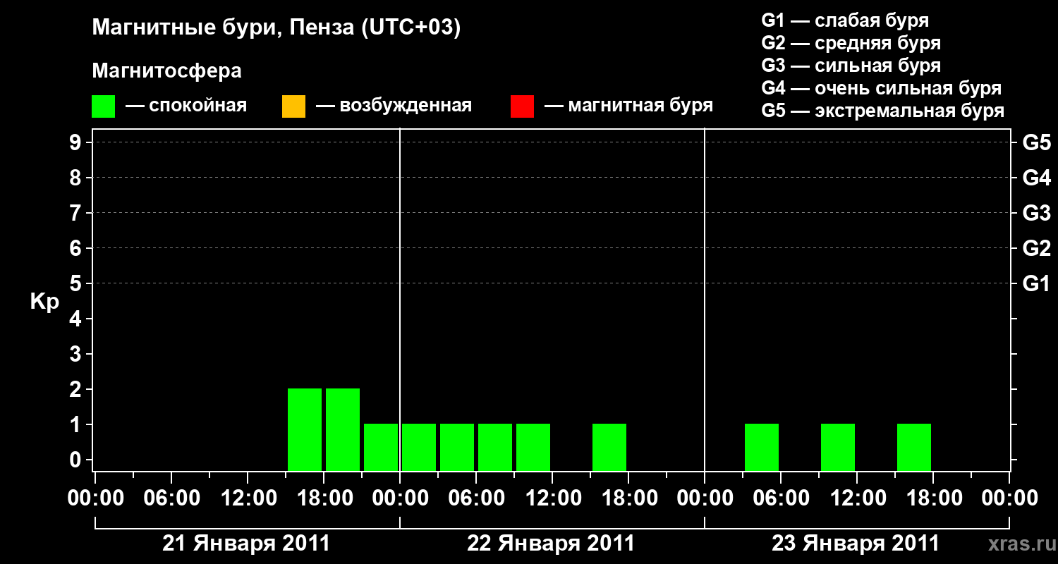 Изменения геомагнитного индекса Kp с 21 по 23 января 2011 года для средних широт