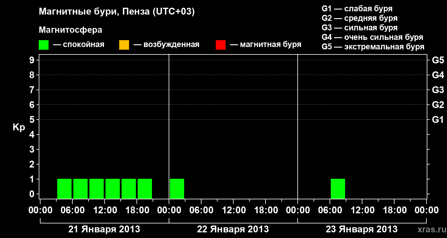 Изменения геомагнитного индекса Kp с 21 по 23 января 2013 года для средних широт