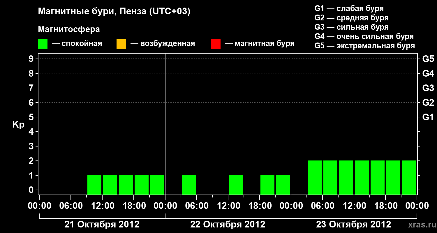 Изменения геомагнитного индекса Kp с 21 по 23 октября 2012 года для средних широт
