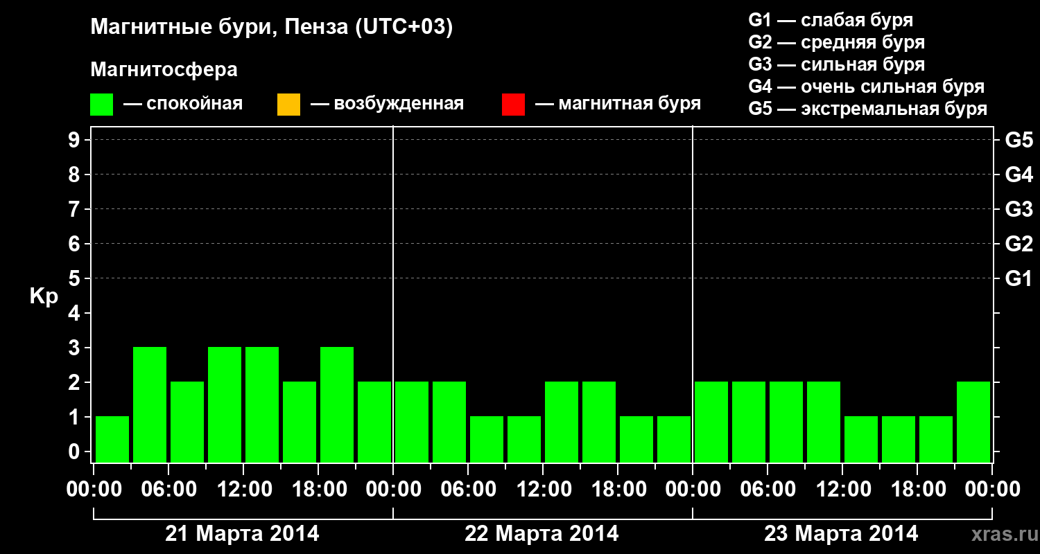 Изменения геомагнитного индекса Kp с 21 по 23 марта 2014 года для средних широт