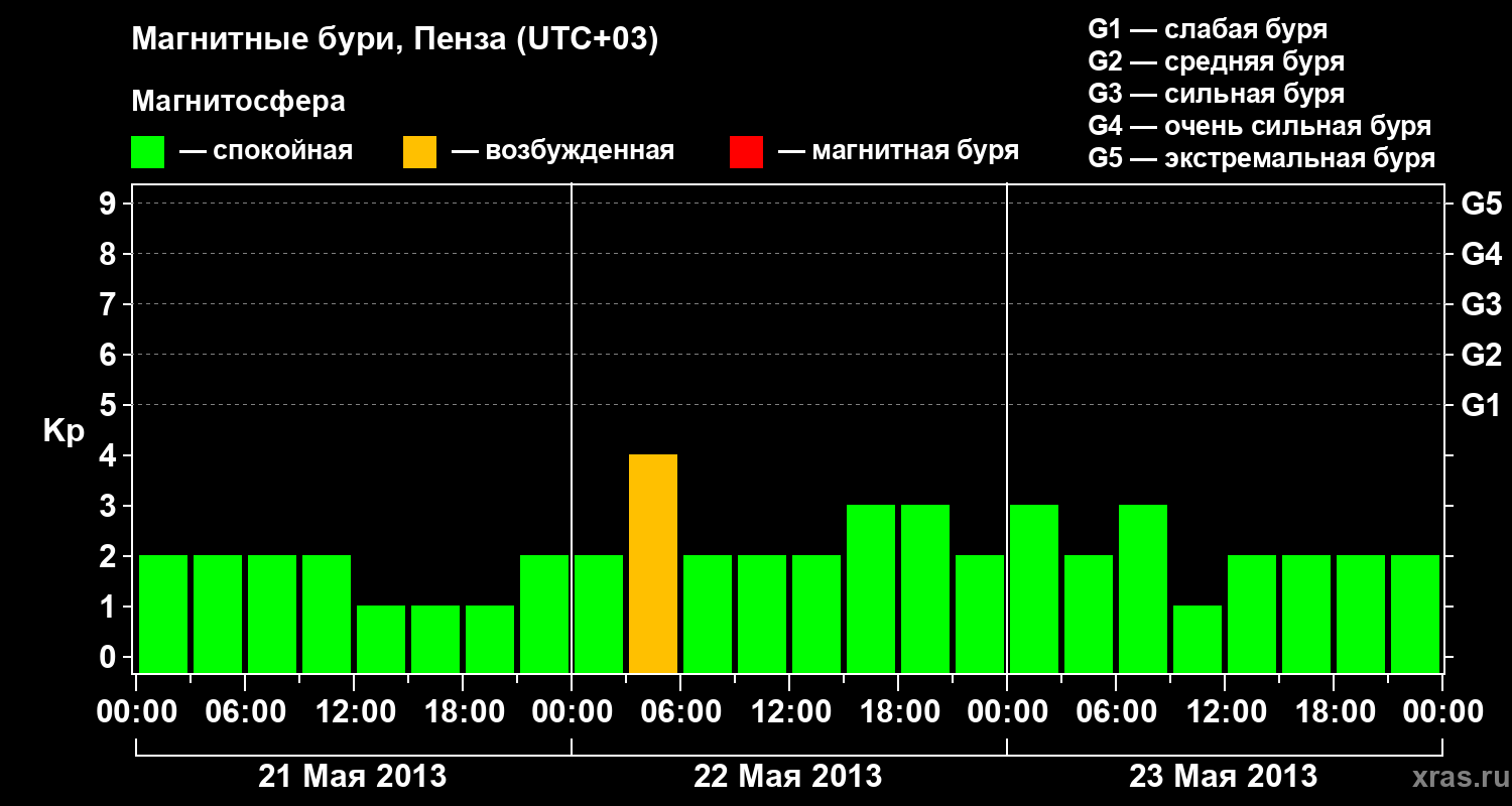 Изменения геомагнитного индекса Kp с 21 по 23 мая 2013 года для средних широт