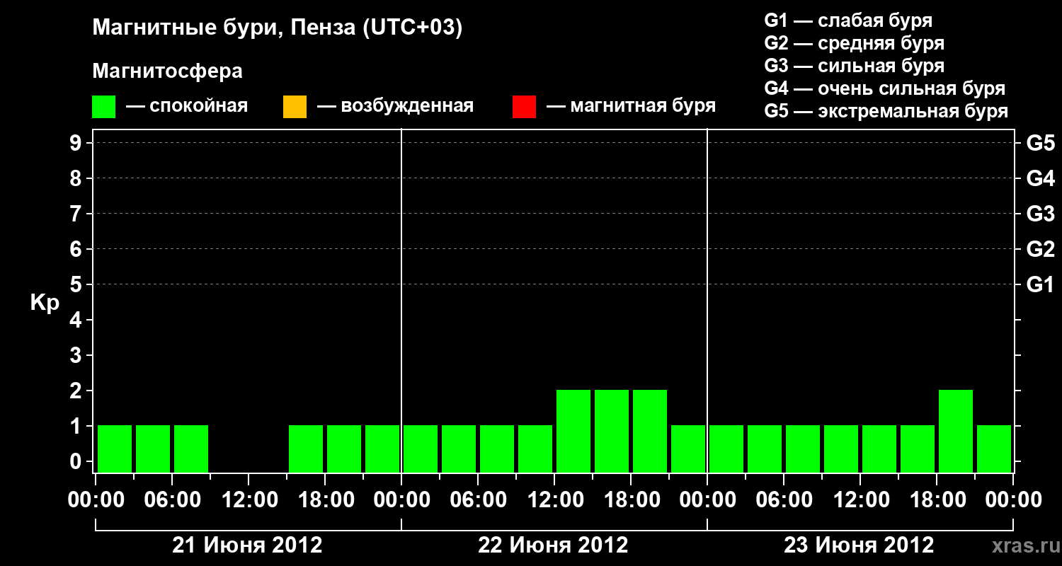 Изменения геомагнитного индекса Kp с 21 по 23 июня 2012 года для средних широт