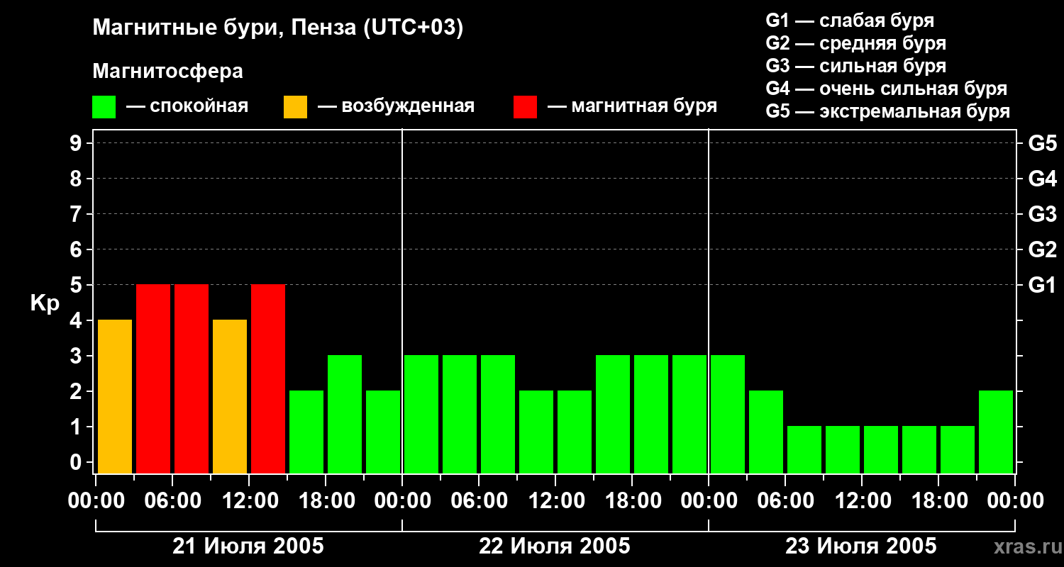 Изменения геомагнитного индекса Kp с 21 по 23 июля 2005 года для средних широт