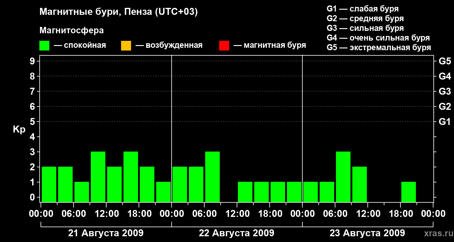 Изменения геомагнитного индекса Kp с 21 по 23 августа 2009 года для средних широт