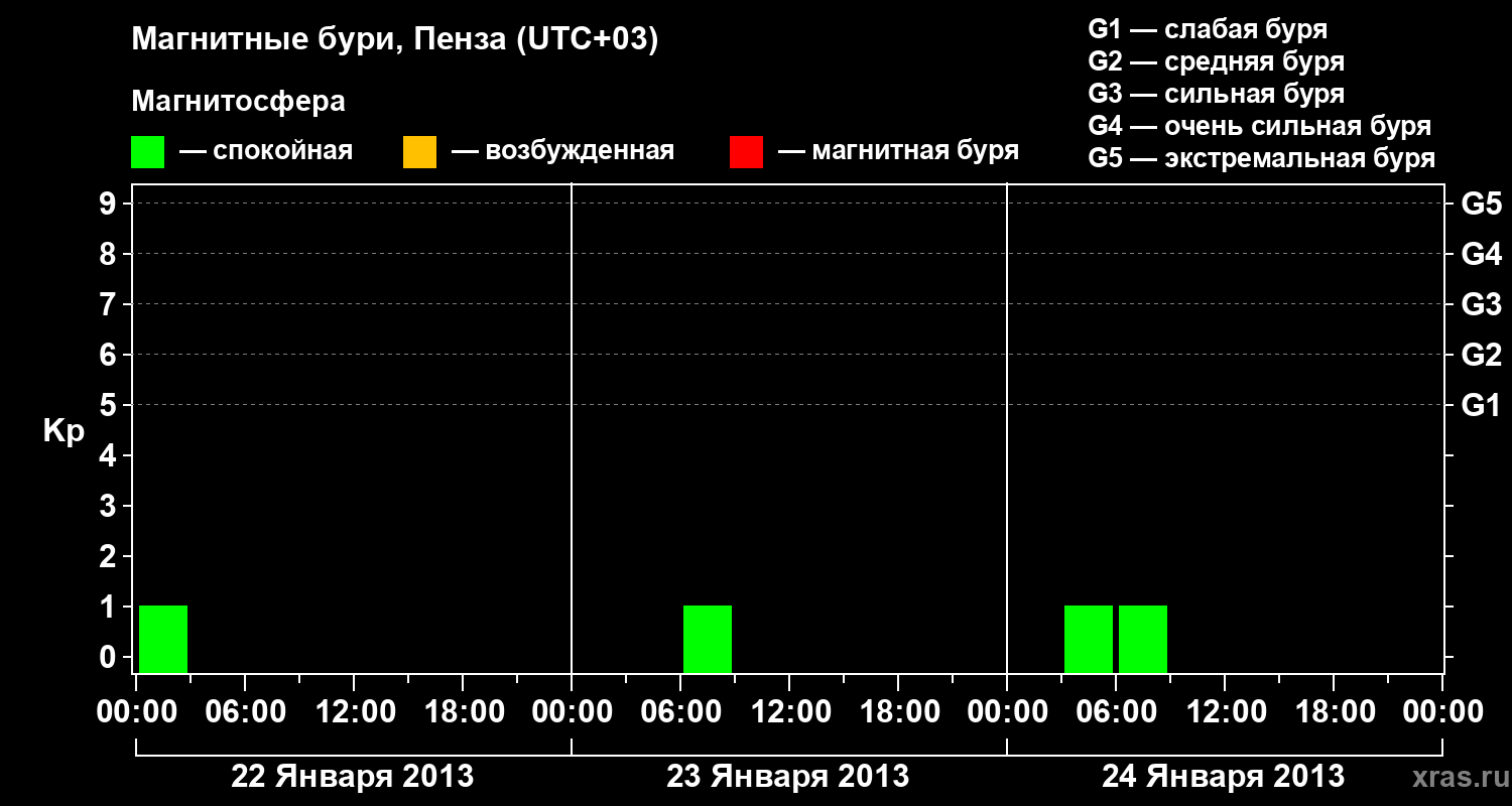 Изменения геомагнитного индекса Kp с 22 по 24 января 2013 года для средних широт