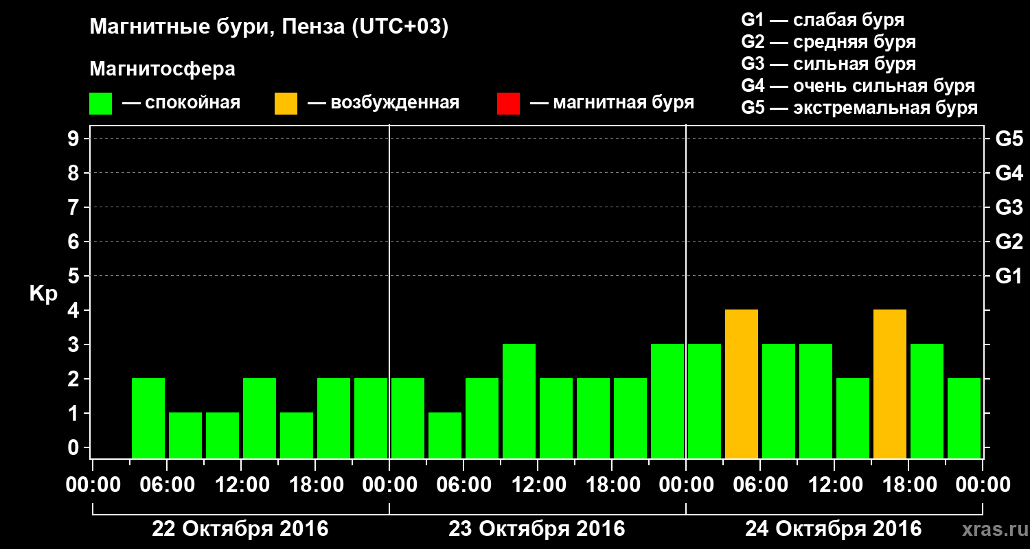 Изменения геомагнитного индекса Kp с 22 по 24 октября 2016 года для средних широт