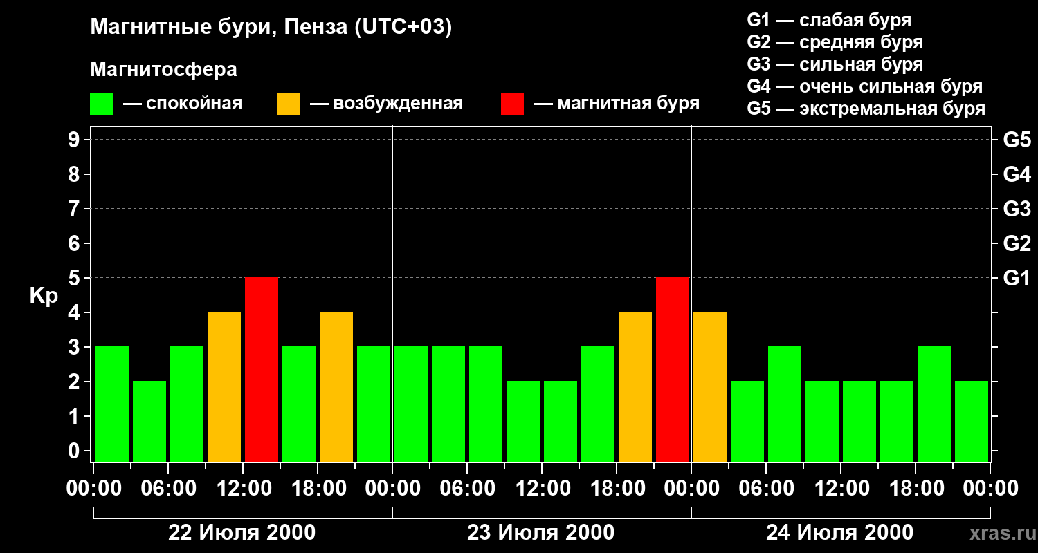 Изменения геомагнитного индекса Kp с 22 по 24 июля 2000 года для средних широт