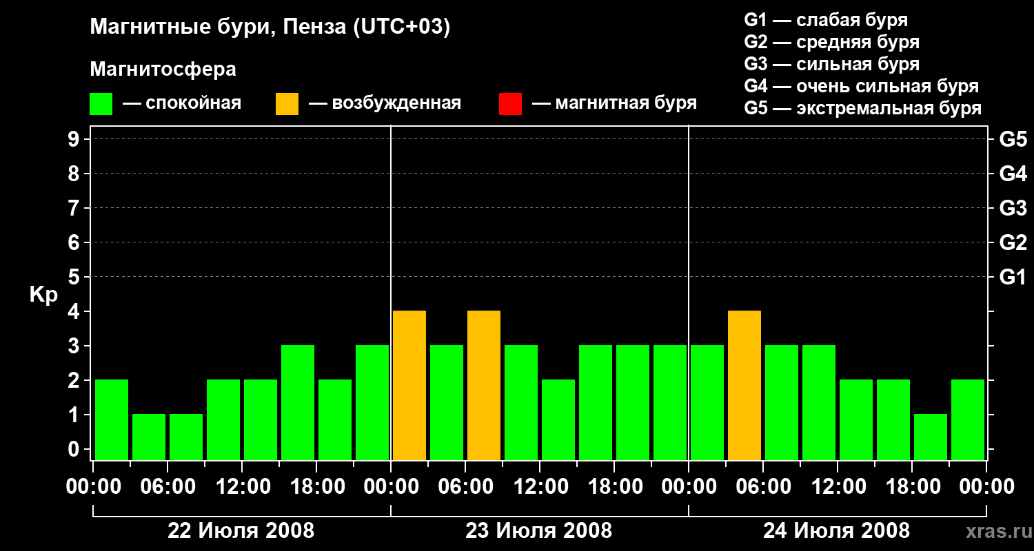 Изменения геомагнитного индекса Kp с 22 по 24 июля 2008 года для средних широт