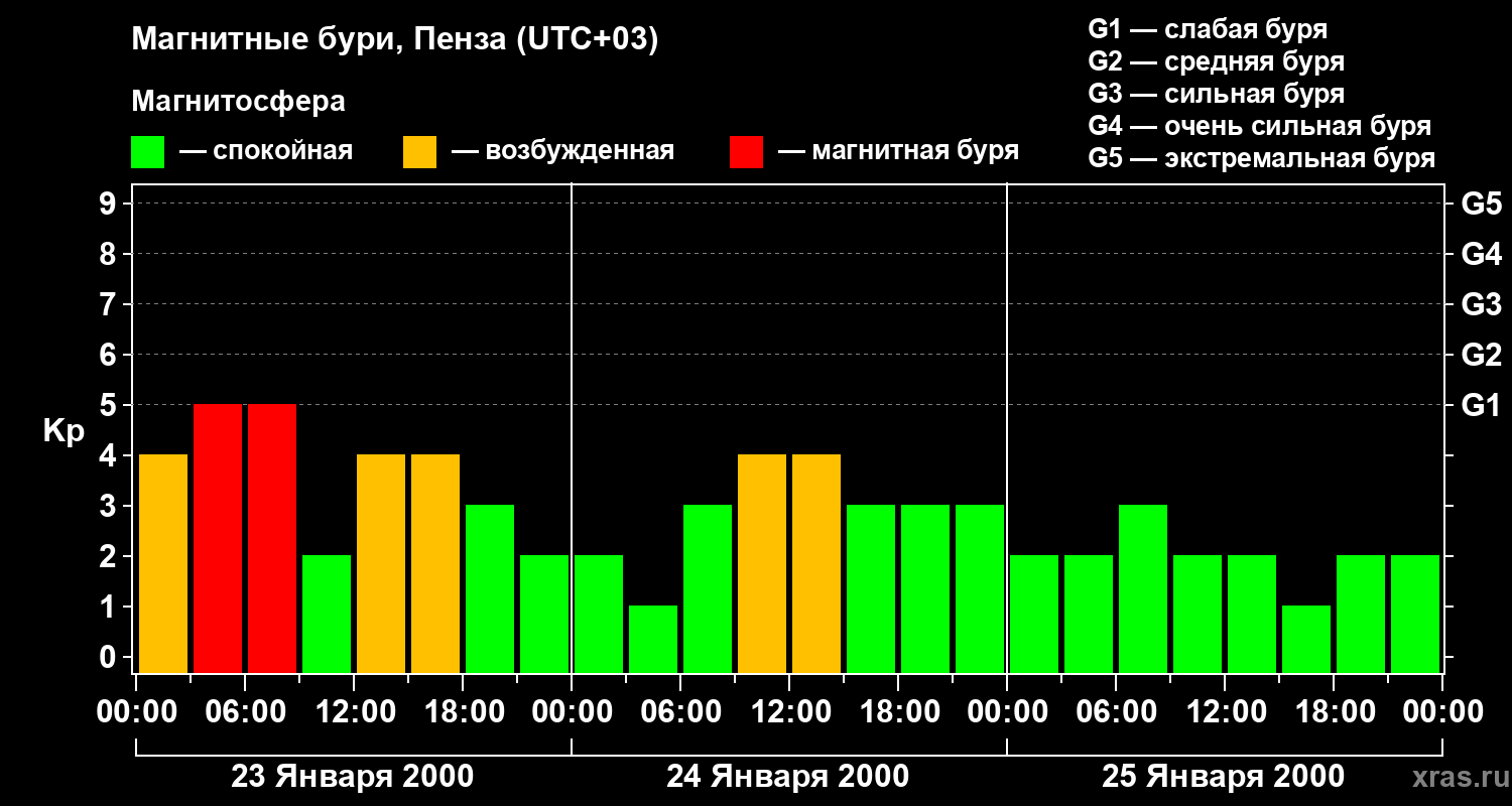 Изменения геомагнитного индекса Kp с 23 по 25 января 2000 года для средних широт