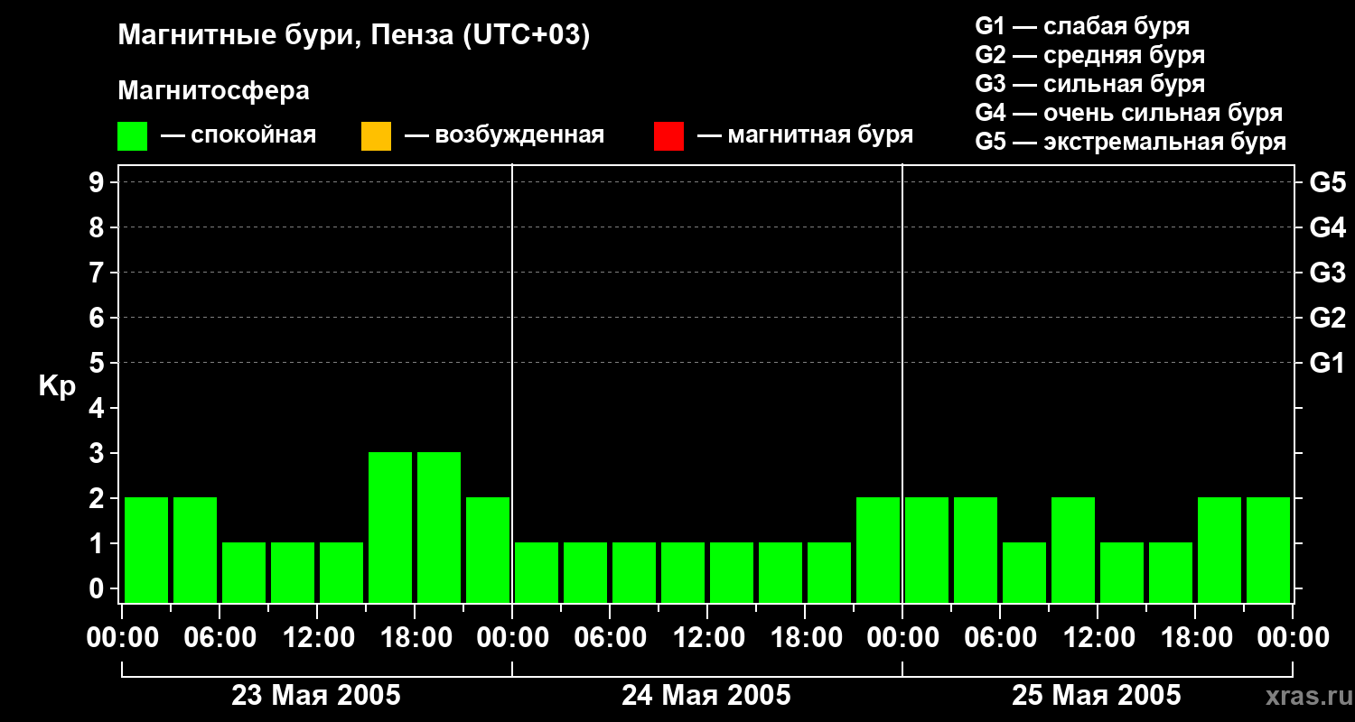 Изменения геомагнитного индекса Kp с 23 по 25 мая 2005 года для средних широт
