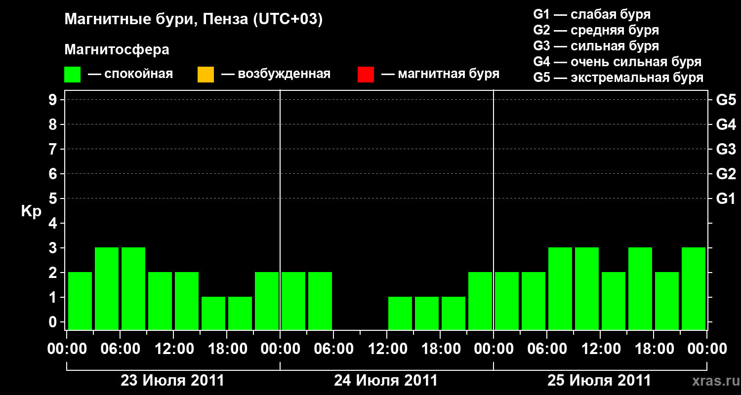 Изменения геомагнитного индекса Kp с 23 по 25 июля 2011 года для средних широт