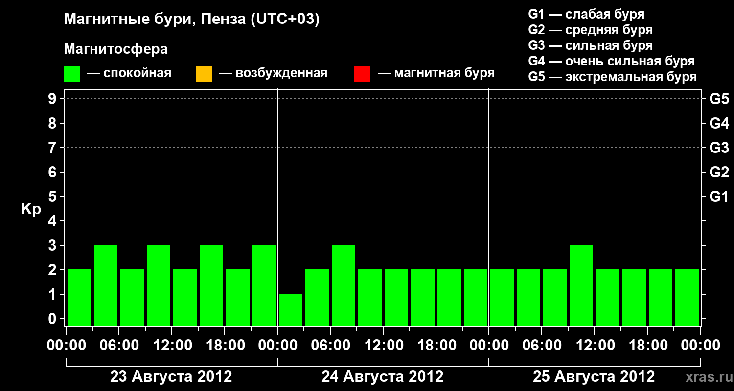 Изменения геомагнитного индекса Kp с 23 по 25 августа 2012 года для средних широт