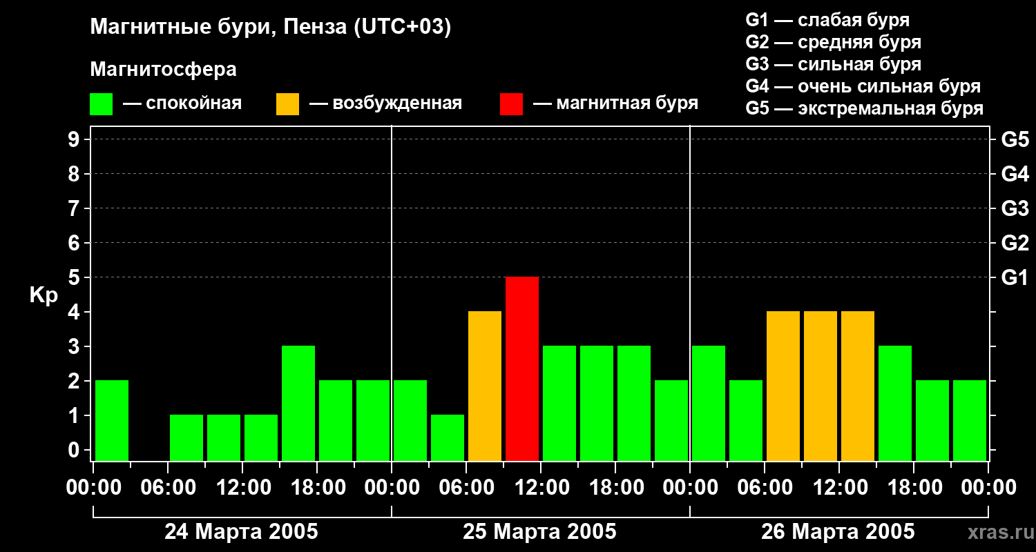 Изменения геомагнитного индекса Kp с 24 по 26 марта 2005 года для средних широт