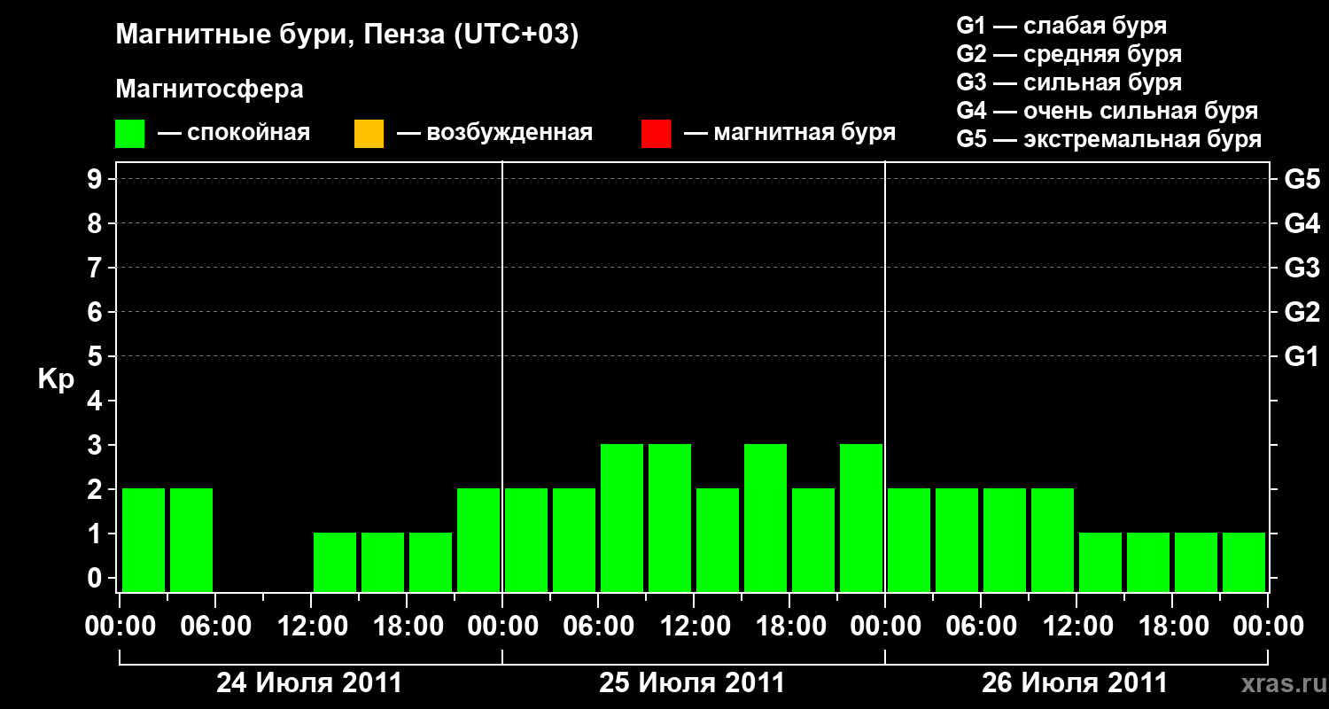 Изменения геомагнитного индекса Kp с 24 по 26 июля 2011 года для средних широт