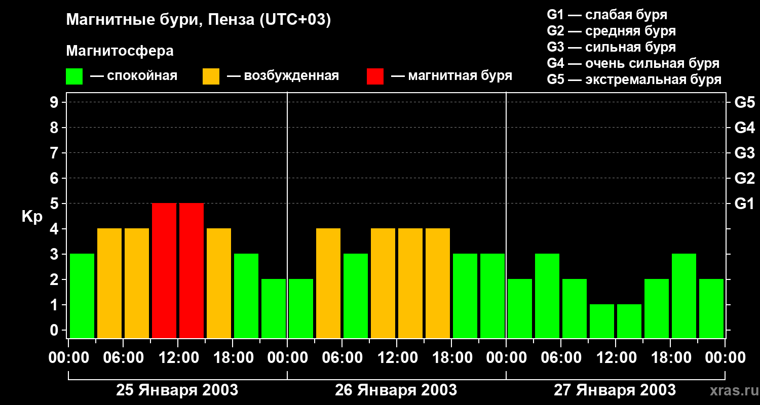 Изменения геомагнитного индекса Kp с 25 по 27 января 2003 года для средних широт