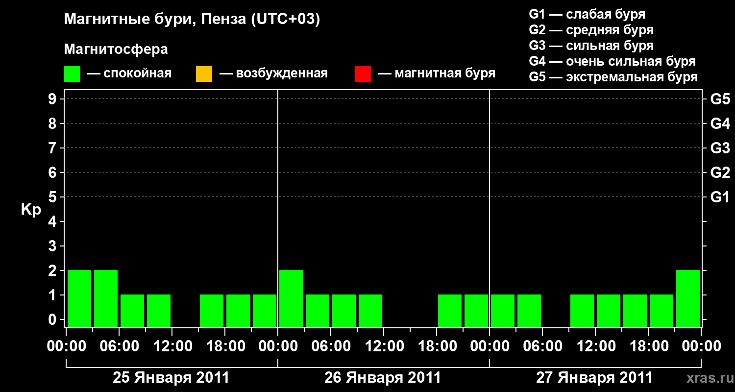 Изменения геомагнитного индекса Kp с 25 по 27 января 2011 года для средних широт