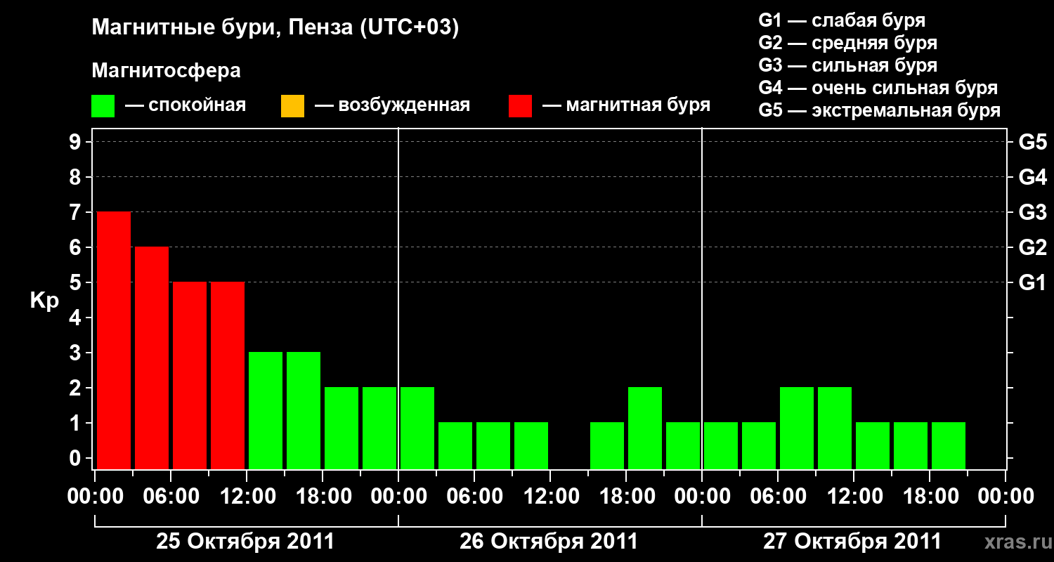 Изменения геомагнитного индекса Kp с 25 по 27 октября 2011 года для средних широт