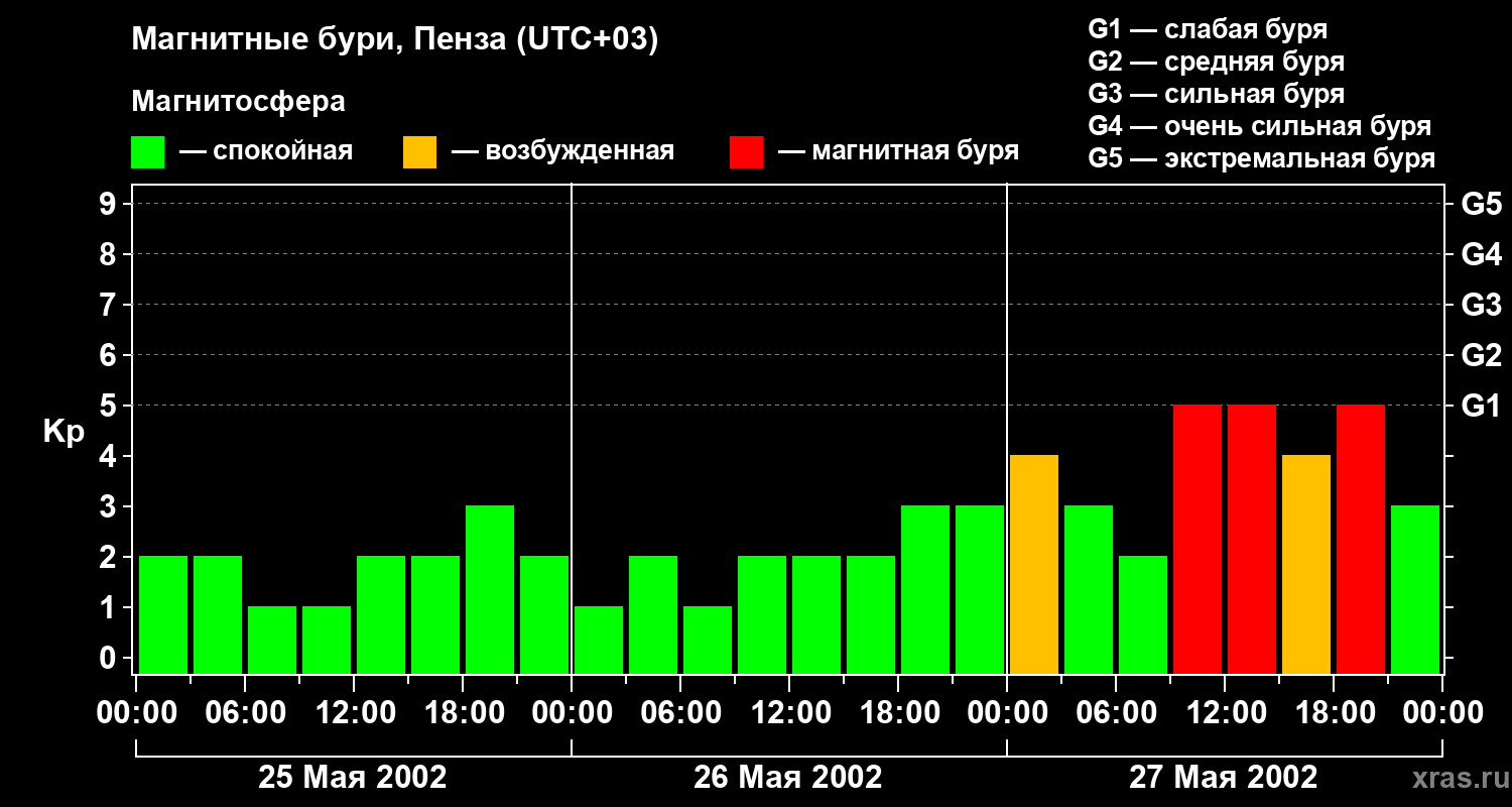 Изменения геомагнитного индекса Kp с 25 по 27 мая 2002 года для средних широт