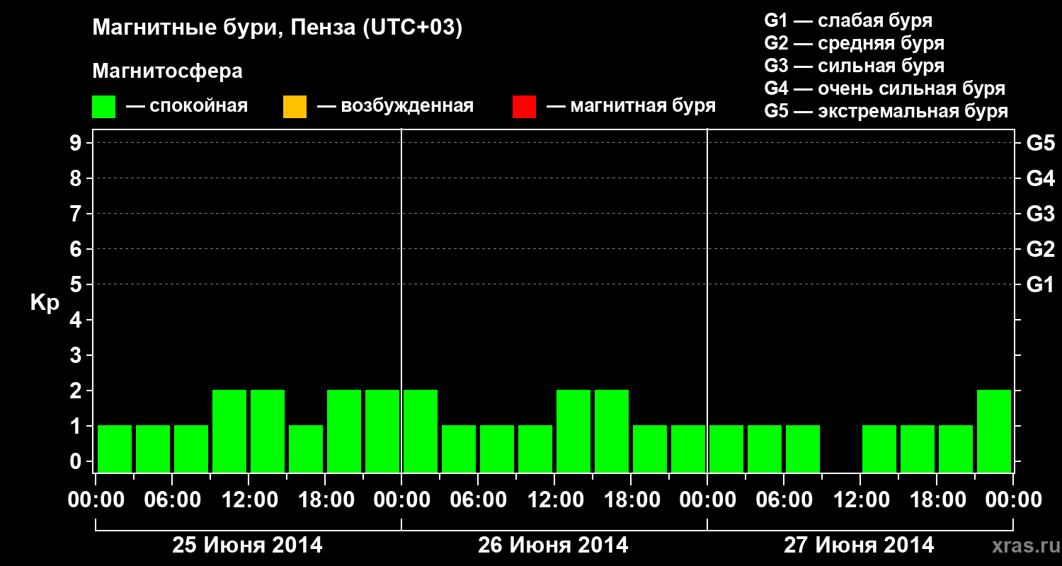 Изменения геомагнитного индекса Kp с 25 по 27 июня 2014 года для средних широт