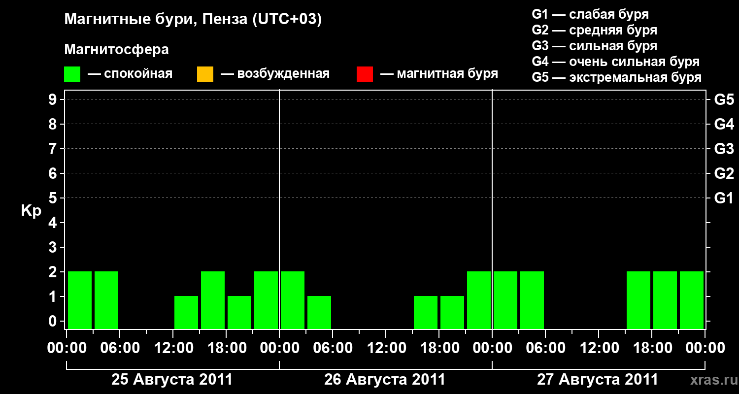 Изменения геомагнитного индекса Kp с 25 по 27 августа 2011 года для средних широт