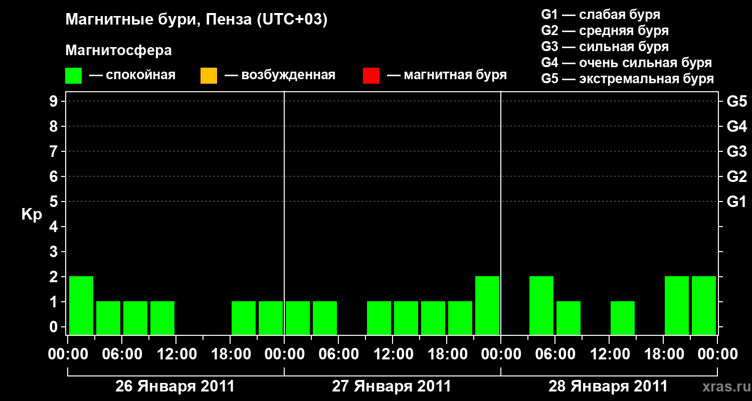 Изменения геомагнитного индекса Kp с 26 по 28 января 2011 года для средних широт