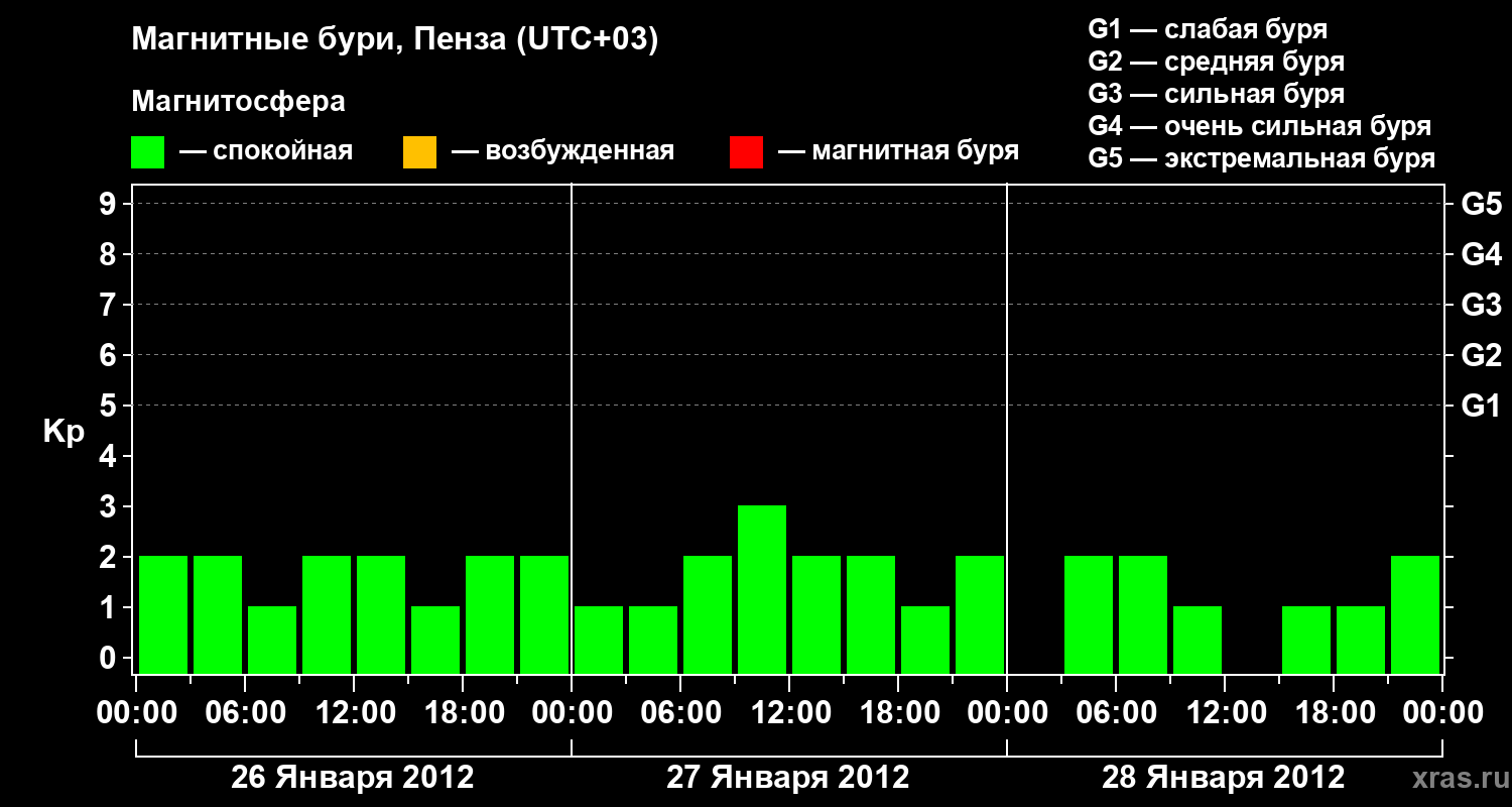 Изменения геомагнитного индекса Kp с 26 по 28 января 2012 года для средних широт