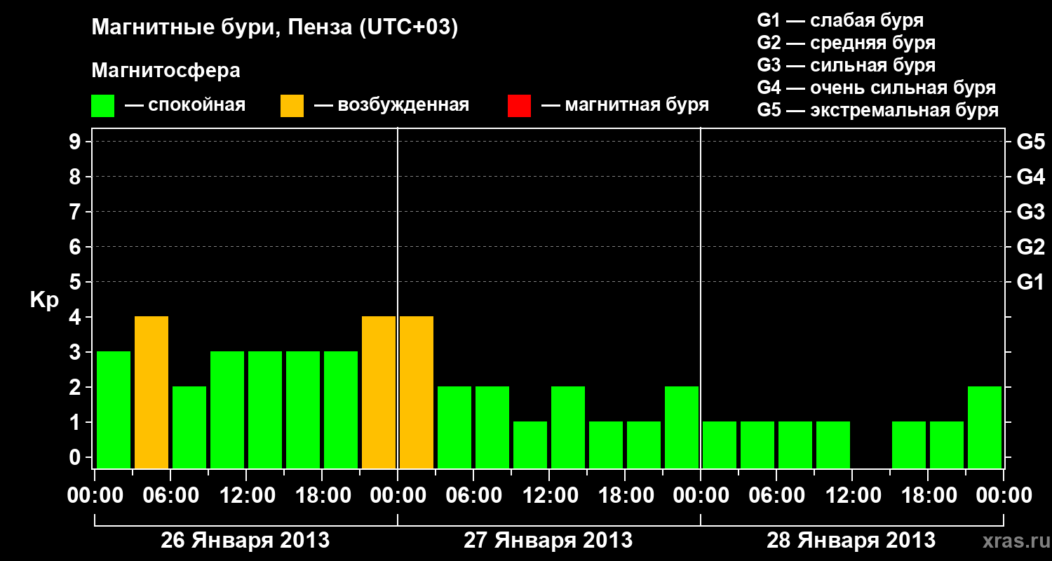 Изменения геомагнитного индекса Kp с 26 по 28 января 2013 года для средних широт
