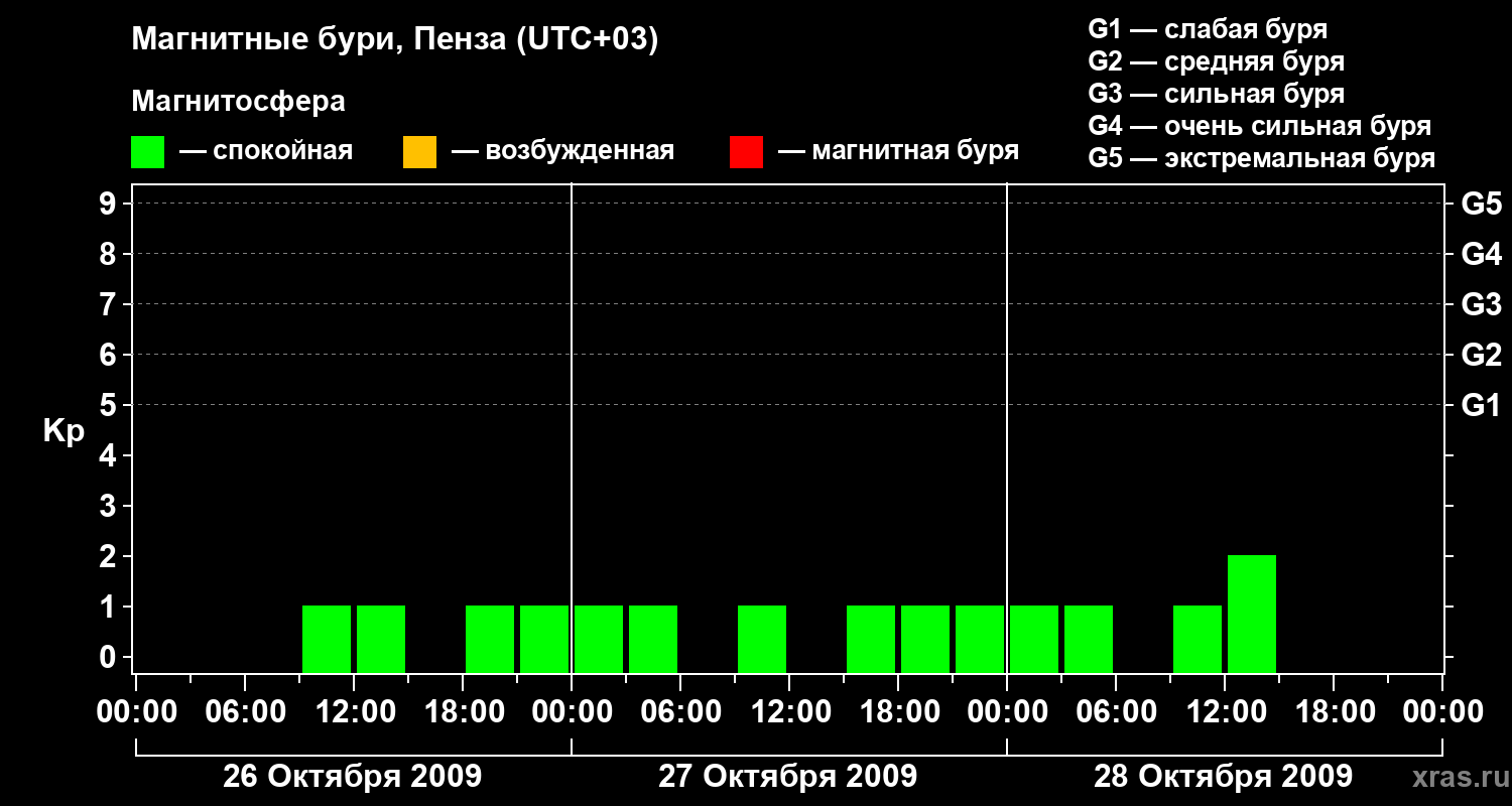 Изменения геомагнитного индекса Kp с 26 по 28 октября 2009 года для средних широт