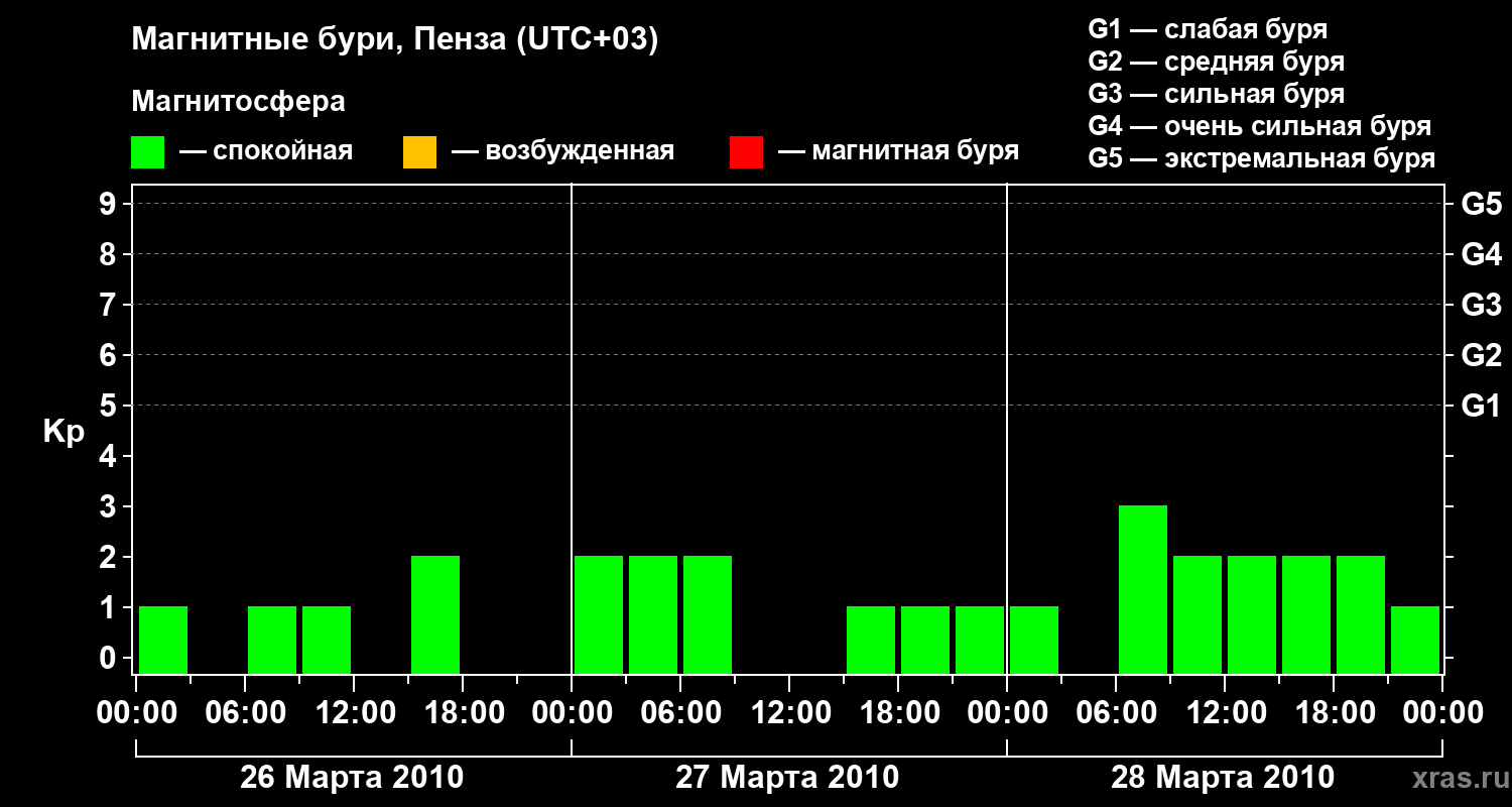 Изменения геомагнитного индекса Kp с 26 по 28 марта 2010 года для средних широт