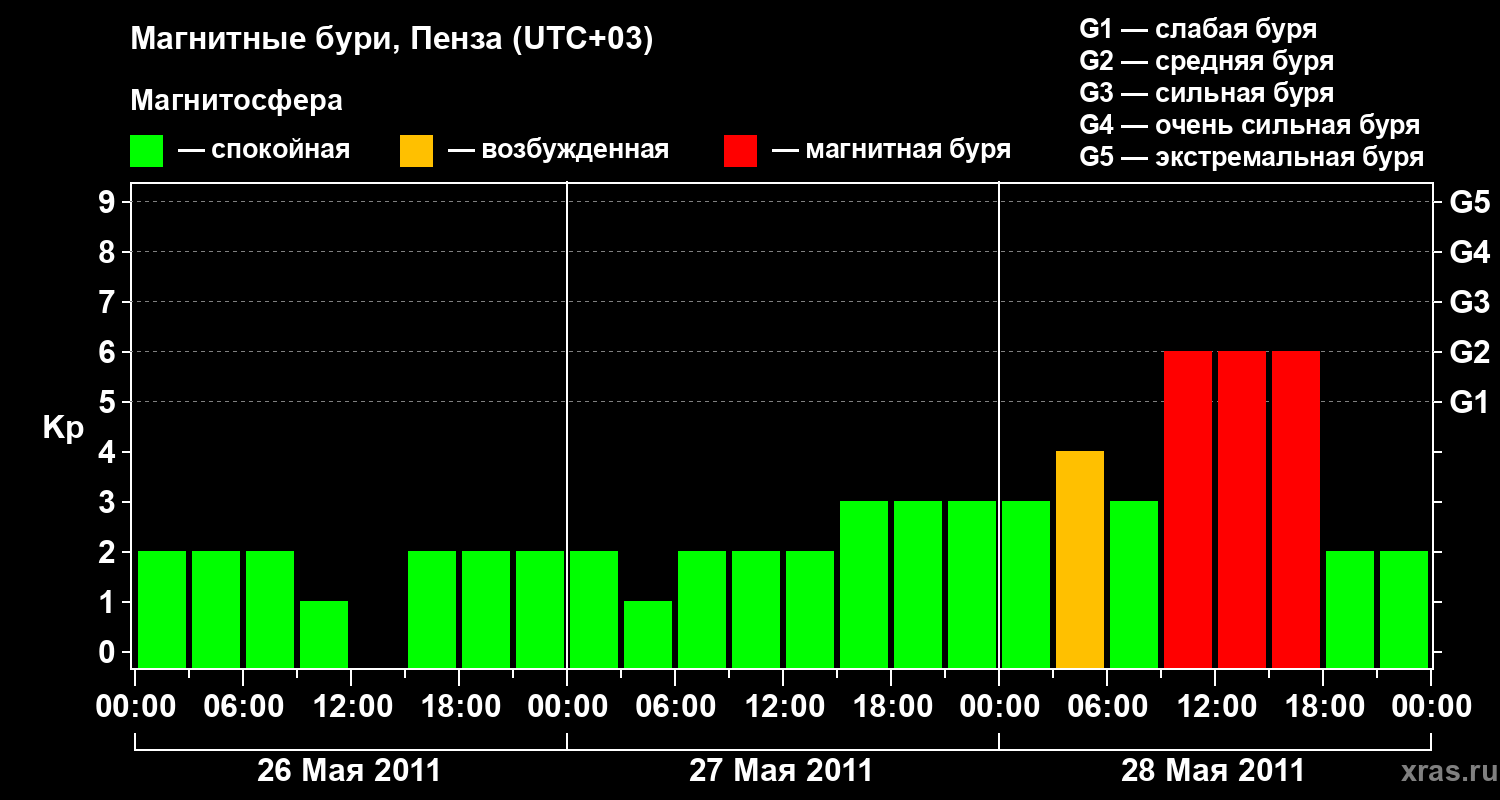 Изменения геомагнитного индекса Kp с 26 по 28 мая 2011 года для средних широт