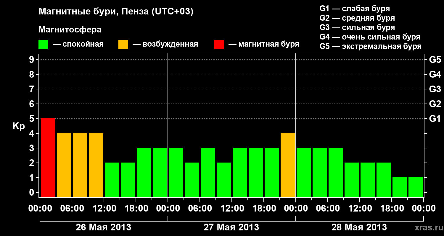Изменения геомагнитного индекса Kp с 26 по 28 мая 2013 года для средних широт