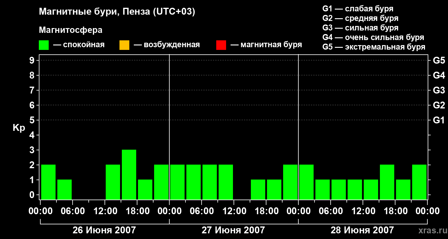 Изменения геомагнитного индекса Kp с 26 по 28 июня 2007 года для средних широт