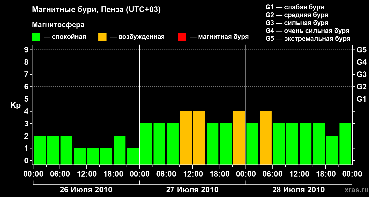 Изменения геомагнитного индекса Kp с 26 по 28 июля 2010 года для средних широт