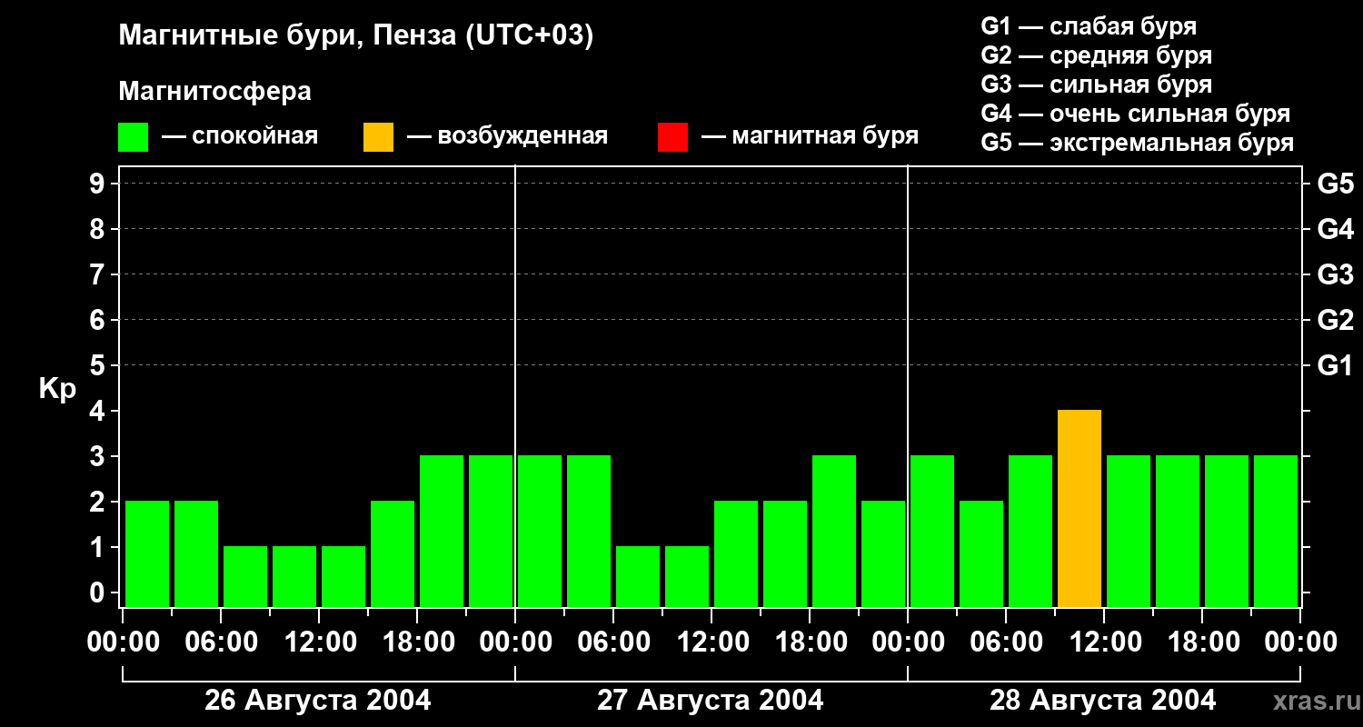 Изменения геомагнитного индекса Kp с 26 по 28 августа 2004 года для средних широт