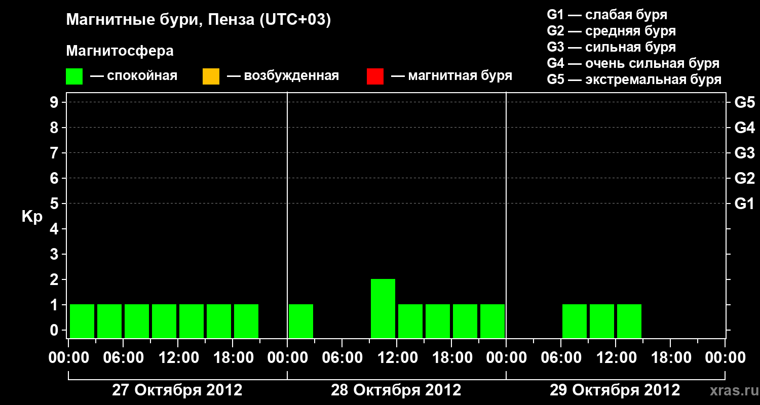 Изменения геомагнитного индекса Kp с 27 по 29 октября 2012 года для средних широт