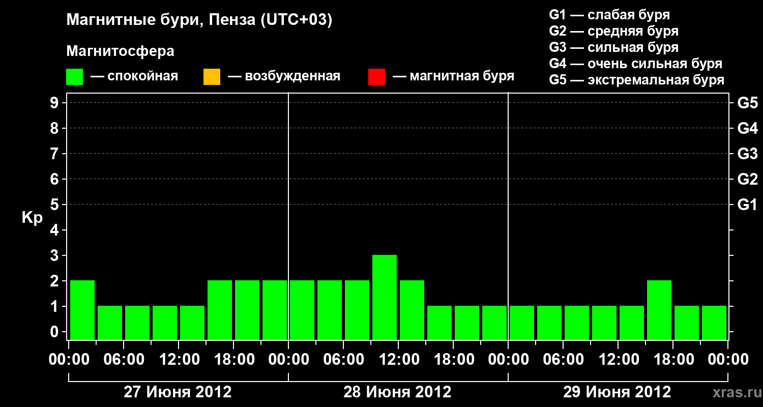 Изменения геомагнитного индекса Kp с 27 по 29 июня 2012 года для средних широт