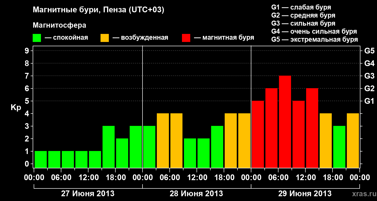 Изменения геомагнитного индекса Kp с 27 по 29 июня 2013 года для средних широт