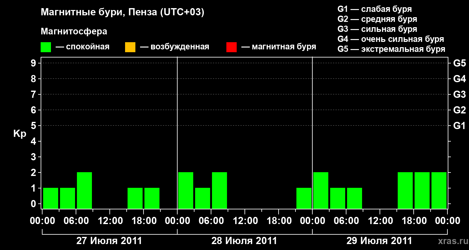Изменения геомагнитного индекса Kp с 27 по 29 июля 2011 года для средних широт