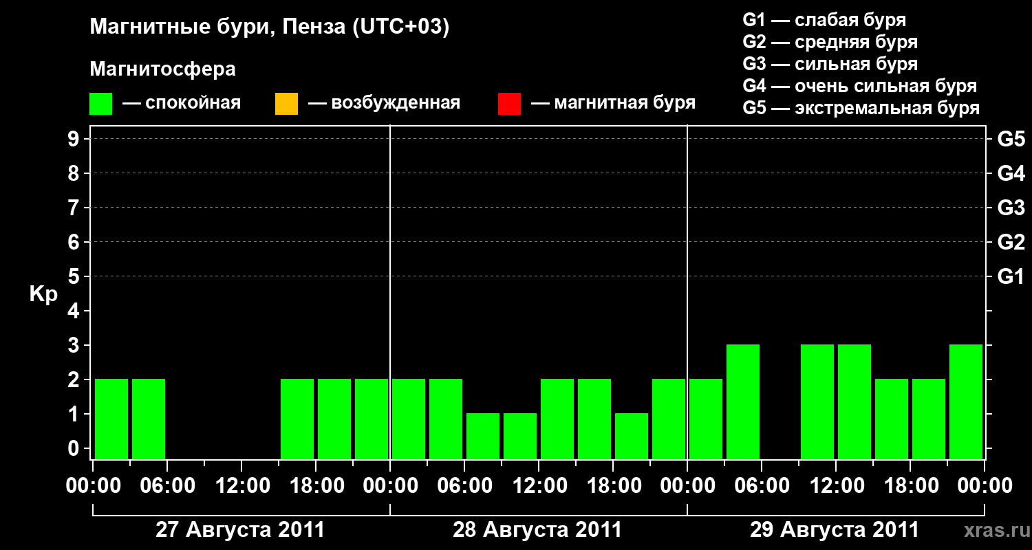 Изменения геомагнитного индекса Kp с 27 по 29 августа 2011 года для средних широт