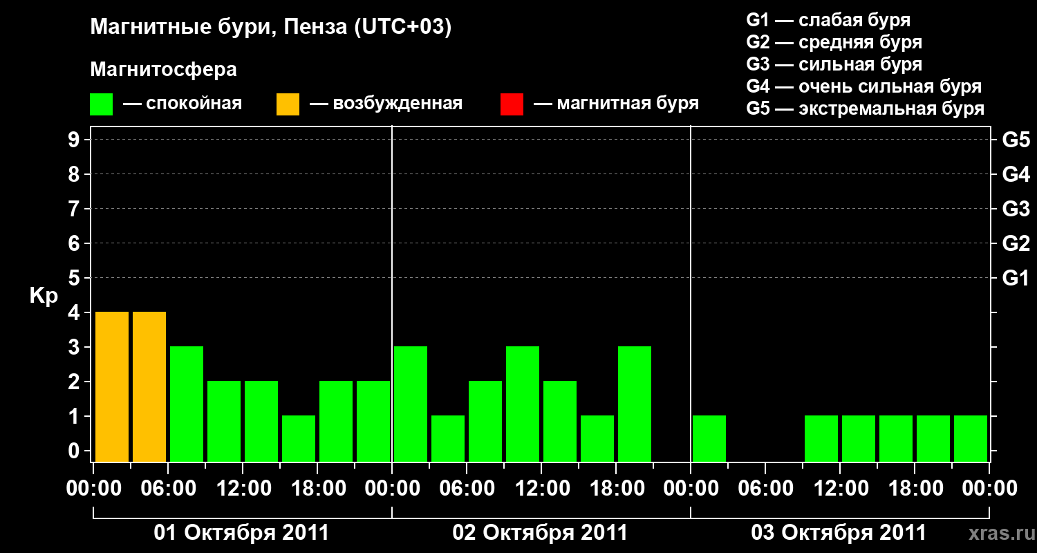 Изменения геомагнитного индекса Kp с 1 по 3 октября 2011 года для средних широт