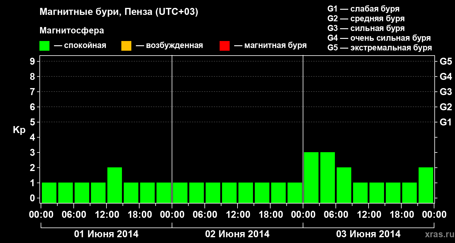 Изменения геомагнитного индекса Kp с 1 по 3 июня 2014 года для средних широт