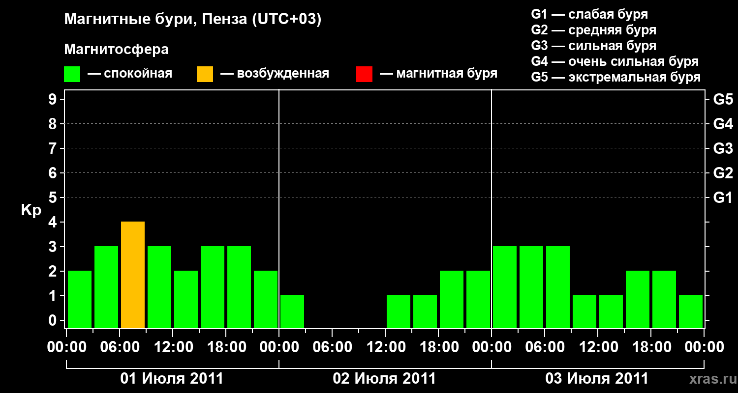 Изменения геомагнитного индекса Kp с 1 по 3 июля 2011 года для средних широт